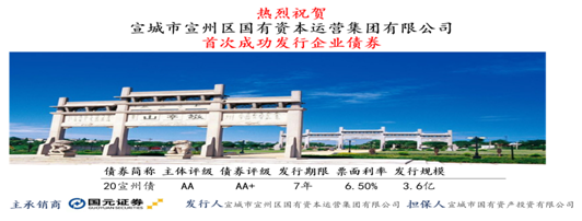 12月2日 ,我公司“2020年宣城市宣州區(qū)國有資本運(yùn)營集團(tuán)有限公司企業(yè)債券”成功發(fā)行。本次債券由國元證券有限公司主承銷,發(fā)行規(guī)模3.6億元,發(fā)行期限7年,主體評級AA,債項(xiàng)評級AA+,票面利率6.5%。本期債券為我集團(tuán)公司首次公開發(fā)行企業(yè)債券,也是宣州區(qū)內(nèi)企業(yè)首次公開發(fā)行企業(yè)債券。
