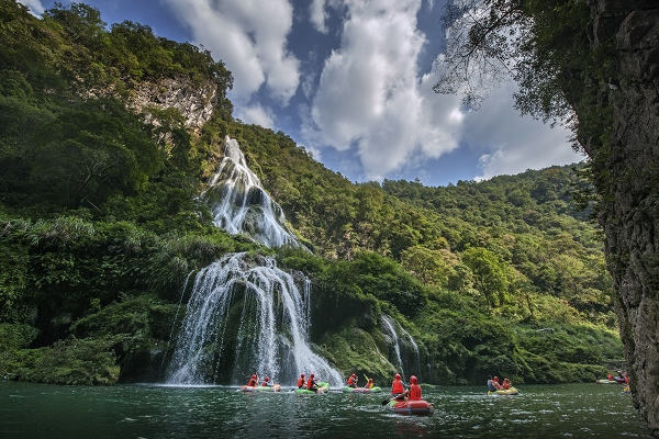 猛洞河漂流,起點哈妮宮距王村約40公里,行車1小時,終點牛路河距王村30分鐘的車程,漂流水路長17公里,漂流兩個半小時。從哈妮宮放舟而下,一路是古老的河道,絕壁百里,怪石嶙峋,灘奇水異,兩岸蒼翠的林木,云霧繚繞,飛瀑流泉與溶巖峰林交相輝映。拐一百五十五個彎,在一百三十三個灘潭中穿梭而行,迂回流連,馳魂奔魄,心曠神怡。