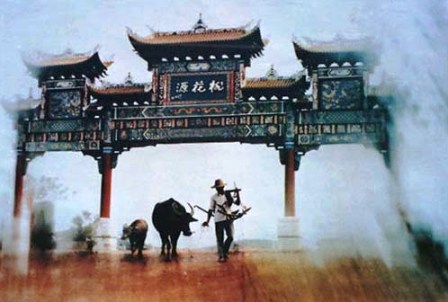 一千五百多年前,東晉大詩人陶淵明寫了一篇千古名文《桃花源記》(為其詩《桃花源》之序)。說是武陵地方的一個漁夫,沿著一條小溪航行,忽然看到山中有一個缺口,就丟下船從這缺口里走進去,發(fā)現(xiàn)了另外一個世界。在這個世界里,土地平曠,房屋整齊,人民生活古樸而富裕,男女老少熙熙為樂,看到漁人大吃一驚,紛紛請他回家吃飯飲酒,自稱祖先是為了逃避秦時的戰(zhàn)亂,逃進桃花源來生活。這些人不知道秦以后有過漢朝,漢朝以后又有晉朝。漁人在這桃花源里住了好幾天,想家了,就與他們告別。出了桃花源,以后再去尋找,就找不到了。
