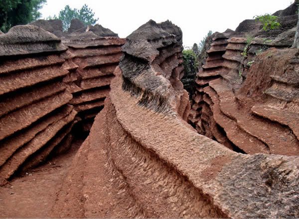 在路邊一棵樹下,一排直徑有30厘米粗、1米多高,排列得像牙齒一般細(xì)密的石柱躲在樹蔭下,似乎在躲著陽光。幾個(gè)多小時(shí)的探尋過程中,“石林”總是讓人驚喜,爬行的劍龍、攀行的巨猿、雅致別趣的“蓮花寶座”和莊嚴(yán)的“佛手”,讓人流連忘返 ……當(dāng)?shù)卮迕裣蛴浾呓榻B道,這只是整個(gè)“石林”的一部分,最大的一片石林大約方圓600畝左右,大部分是紅褐色。前幾年有人帶著專家來考察,說這片石林已經(jīng)沉睡了4億年,是揚(yáng)子古海海底沉積的混合泥砂的碳酸鹽物質(zhì)形成的巖石,再經(jīng)地殼運(yùn)動(dòng)和侵蝕、溶蝕作用,就形成今天的奇觀。但卻由于投入資金量及交通等方面的考量,遲遲沒有人投資。