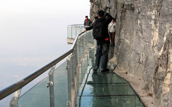 玻璃棧道是張家界天門山景區(qū)繼懸于峭壁之上的鬼谷棧道、憑空伸出的玻璃眺望臺(tái)、橫跨峽谷的木質(zhì)吊橋后打造的又一試膽新景點(diǎn)。這條看著就讓人腿軟的玻璃橋給人帶來的刺激震撼感可與舉世聞名的美國大峽谷玻璃走廊“天空之路”媲美。