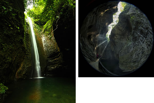西線原名叫雪花溪,又叫雪花洞,水從懸崖上掉下來(lái)濺起水花,泉水與巖石相碰,落成大霧,形成雪花狀,故名雪花溪。因地勢(shì)險(xiǎn)峻,歷代人都沒(méi)有把雪花溪走通過(guò),從下往上看深不見(jiàn)底,古人以為是一個(gè)洞,故又叫雪花洞,其實(shí)是一個(gè)峽谷,有七潭七瀑,現(xiàn)在叫“仙女峽谷”。峽谷長(zhǎng)800米,最窄處僅1米左右,上下落差近200米,因水的長(zhǎng)期回旋沖刷, 巖層的堅(jiān)硬度各異,形成了底寬頂窄,時(shí)北,時(shí)西,時(shí)東,陰暗無(wú)光,形似溶洞, 泉水飛流直下,形成梯級(jí)瀑布,擊打在巖壁上濺起的水花猶如雪花飛舞,潭中一片雪白,古人稱之為雪花洞,峽谷中有七個(gè)各異的潭池在沖擊的水花中若隱若現(xiàn),故改稱為七仙女人間沐浴瑤池,從開(kāi)天辟地起無(wú)人行通過(guò),現(xiàn)在已修好的占道,于峽谷水花之中,幻入仙境之感。