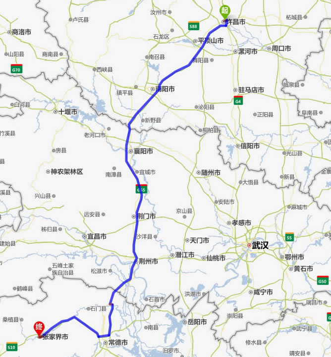 左右,沿途經過許昌——平頂山——南陽——襄陽——荊門——荊州——常德(也可以走國道經澧縣、石門縣)——慈利——張家界。