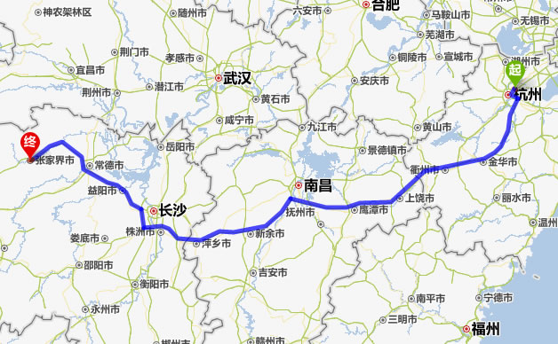 左右,沿途經過余杭——杭州——桐廬縣——建德市——衢州市——上饒市——鷹潭市——新余市——宜春市——萍鄉(xiāng)市——株洲市——湘潭市——寧鄉(xiāng)縣——益陽市——常德市——慈利縣——張家界。
