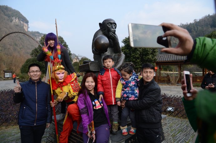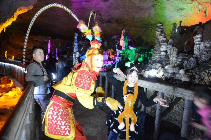 手持金箍棒,頭戴紫金冠。2月2日,農(nóng)歷臘月二十四,中國(guó)傳統(tǒng)小年節(jié)氣。當(dāng)天下午,旅游勝地張家界武陵源黃龍洞景區(qū),一名“美猴王”打扮的特殊游客現(xiàn)身“后天”雕塑、龍宮大廳、花果山等景點(diǎn),其惟妙惟肖的“孫悟空”動(dòng)作表演,不時(shí)引來(lái)其他游客的驚呼:大圣歸來(lái)!